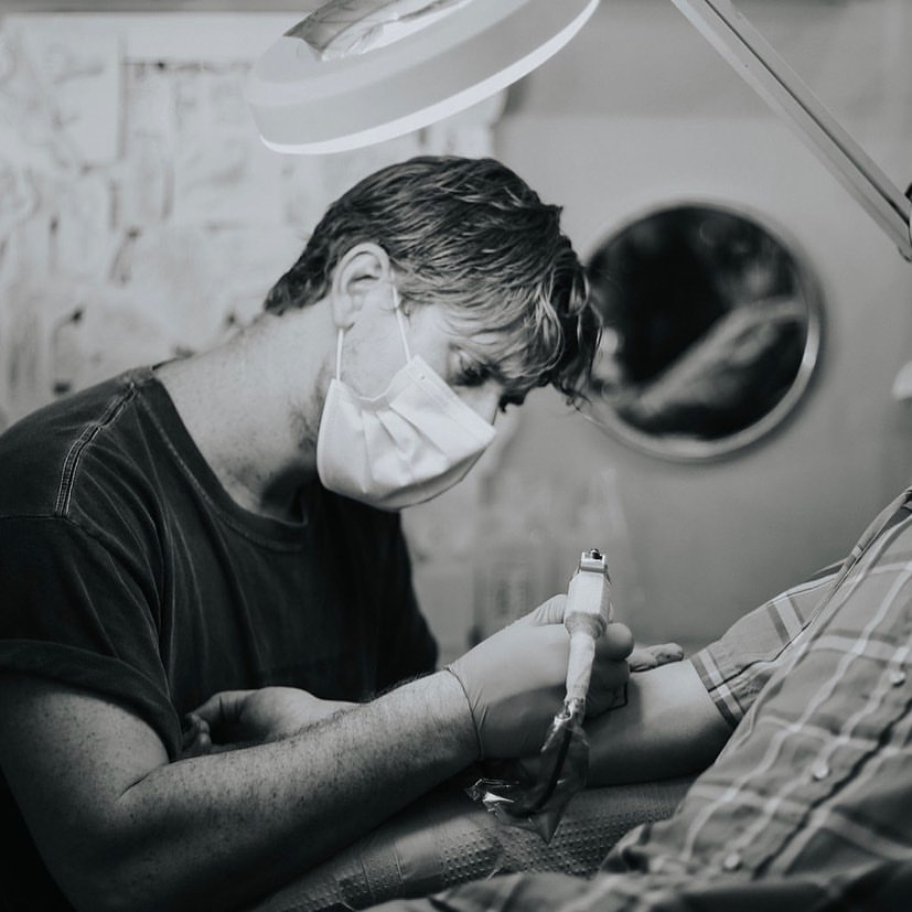 Danny is the OG. Our founder. The Boss. The biggest turd. He started his tattoo journey in ‘99. He’s not tattooing anymore (tattooed for 20 years) and now has a food truck!